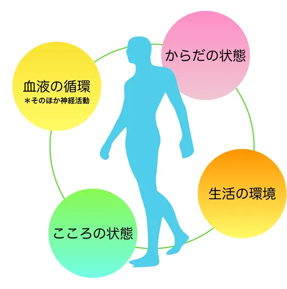 また、例えば怒りやストレスなどの感情、心の状態は指先の冷えを強めたり、動悸や冷や汗といった自律神経系を乱し血液の循環へも影響します。そして、生活環境・習慣が人を作るともまで言われています。